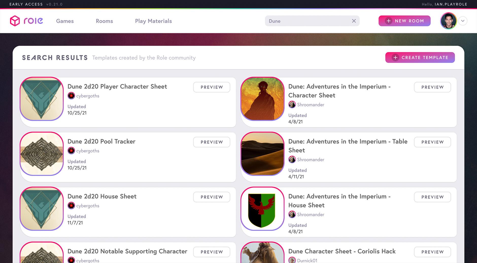 You can now search for sheet templates created by the Role community! With thousands of templates ready to go, you can quickly find exactly what you need for the games you want to play. Today, you'll see the new search bar on your dashboard, type in the name of a game you are interested in to start collecting new templates!