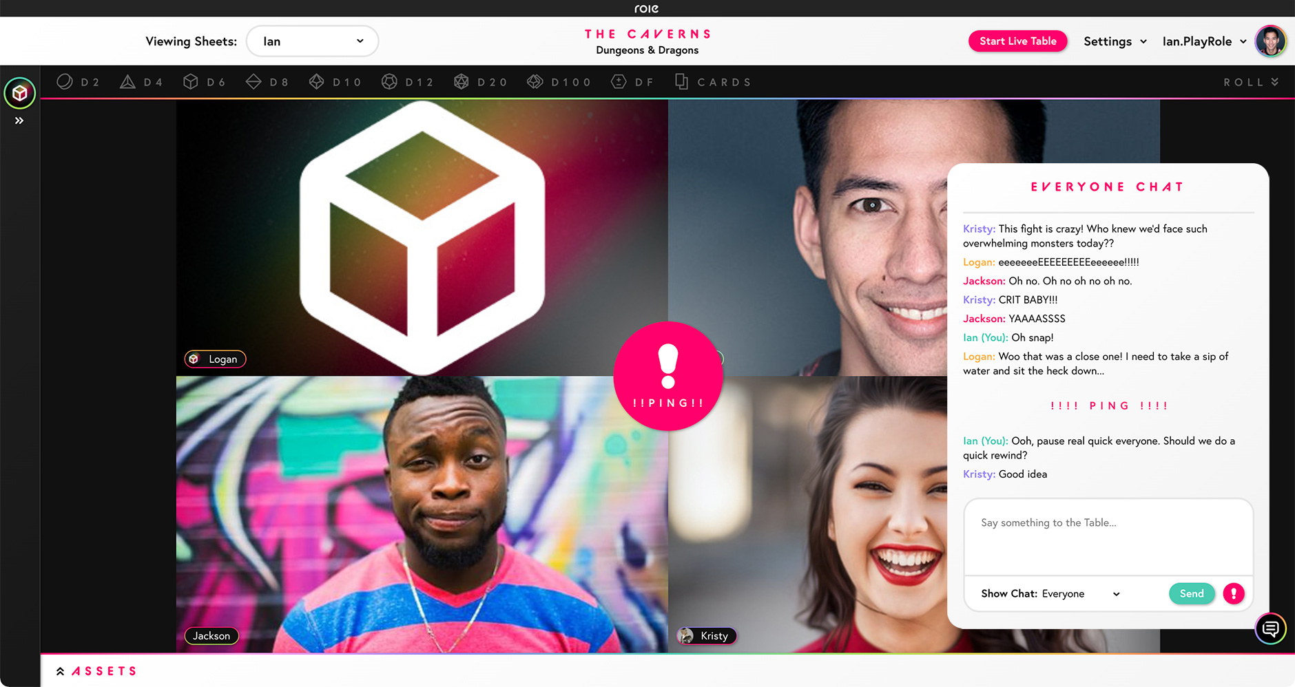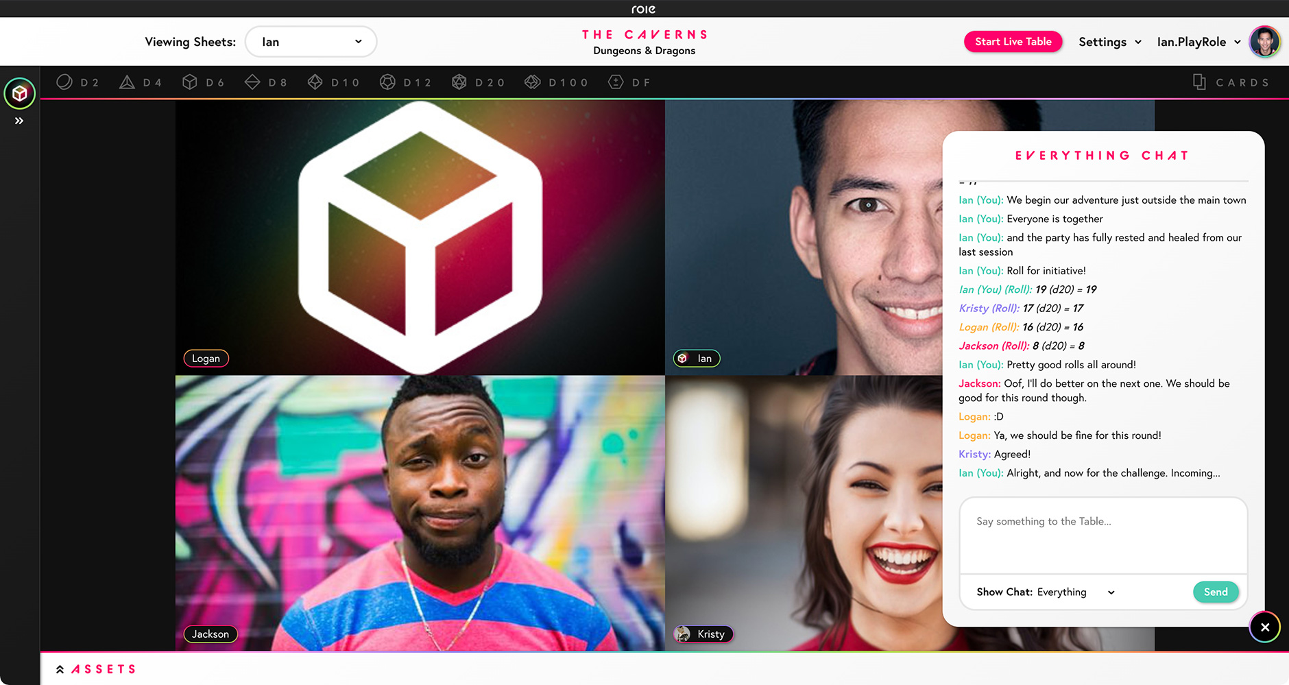 - Everything: A public chat for everyone at the table plus all public dice rolls.